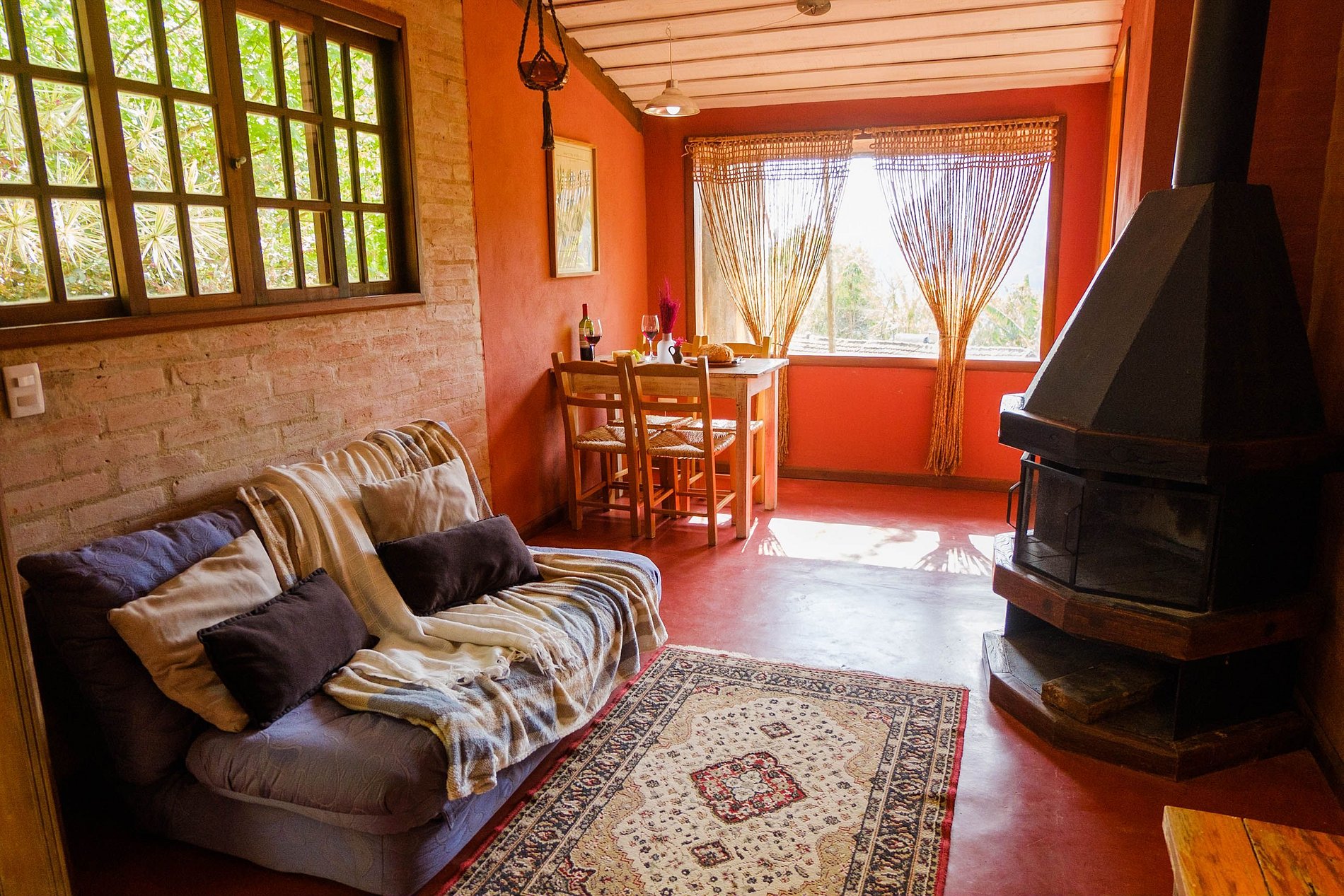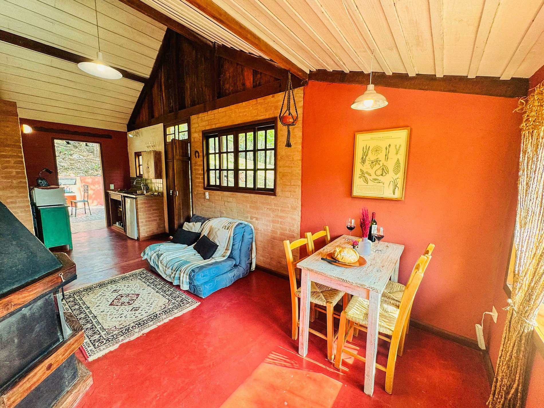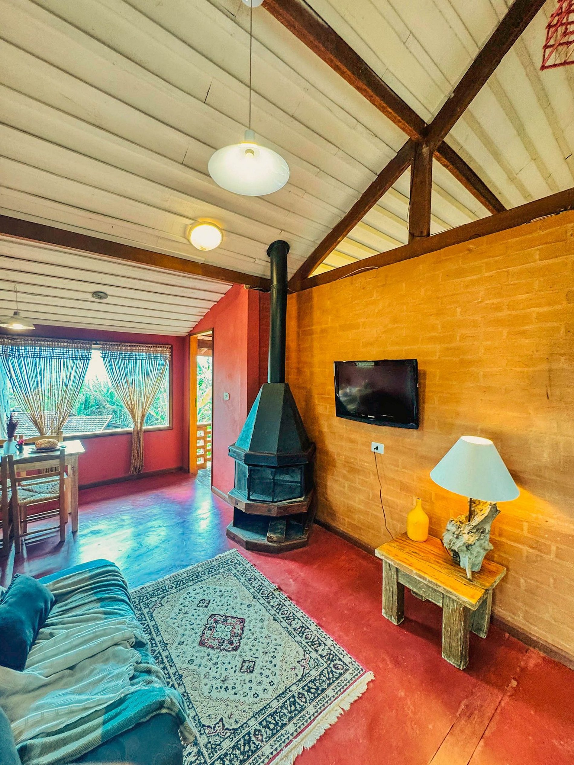 Sala com lareira, cozinha equipada, banheiro com chuveiro elétrico e área de churrasqueira. Acomoda até 4 pessoas confortavelmente (possível receber uma 5a pessoa, que durma no futon da sala)