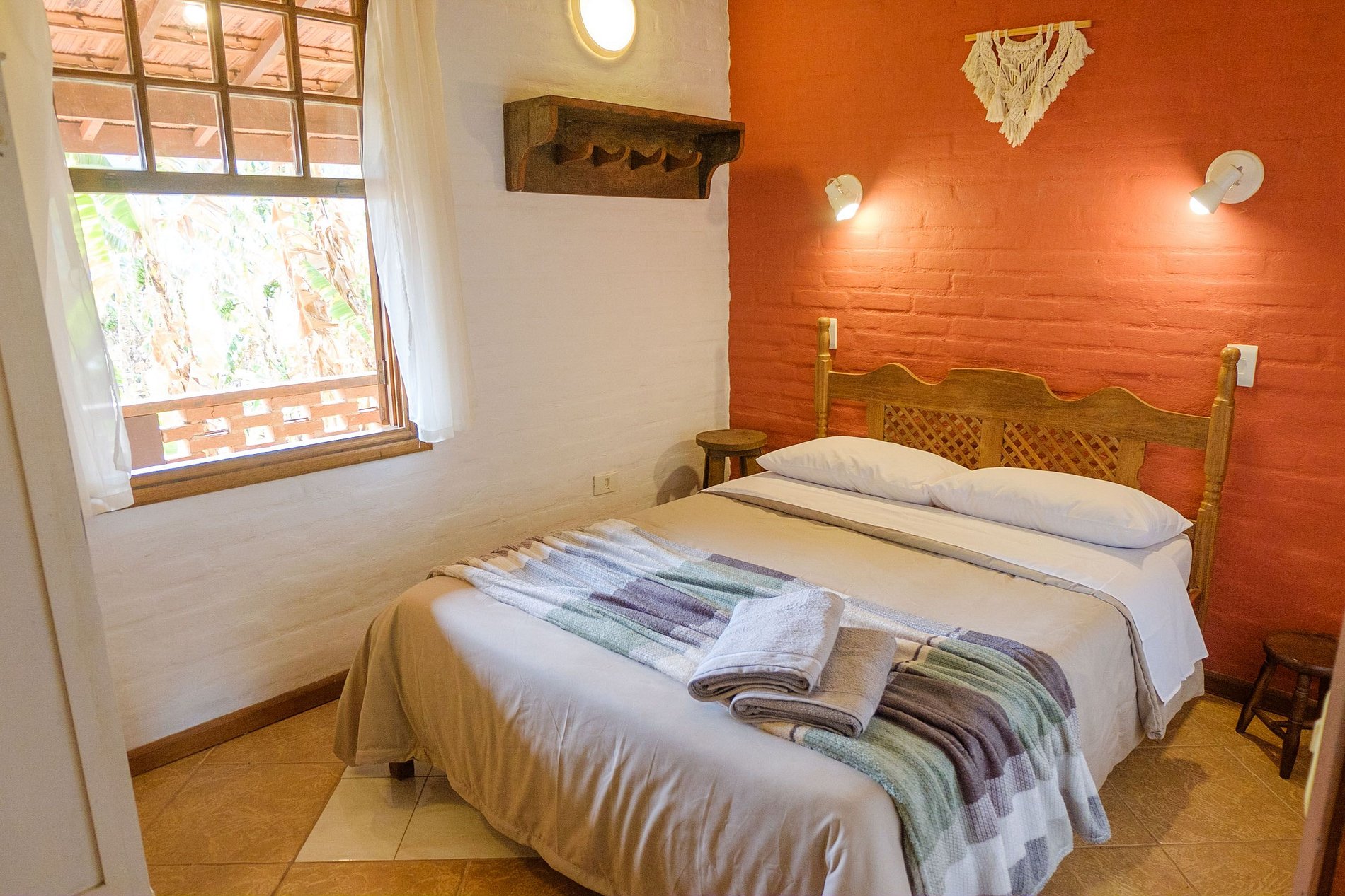 A cabana possui dois quartos, um com cama de casal e outro com bicama de solteiro.