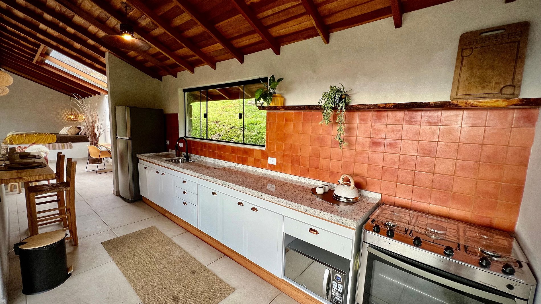 - cozinha equipada com geladeira, fogão com forno, microondas, cafeteira e utensílios
