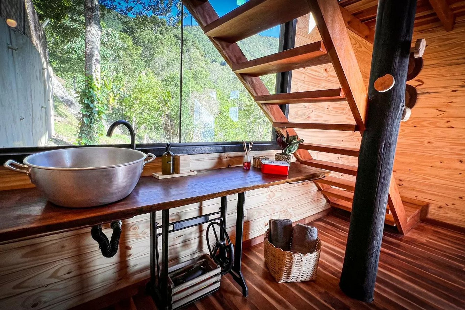 Ao entrar sala e quarto integrados no andar de cima, descendo as escadas tem-se acesso ao banheiro e cozinha. Saindo pela varanda da cozinha terá acesso à área de lazer externa. Há uma smartv no quarto/sala (a tv tem acesso aos aplicativos – não possui antena de tv com canais abertos ou a cabo)