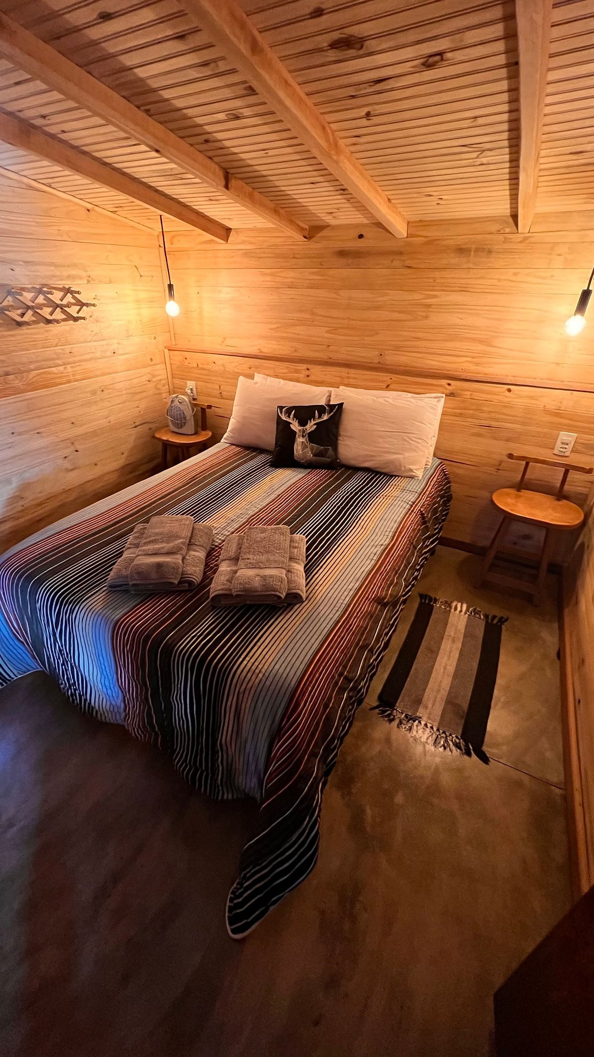 A Cabana Cara de Cão possui dois quartos (um com cama de casal, outro com cama de casal e um beliche), sala com lareira, cozinha equipada, banheiro com chuveiro elétrico e área de churrasqueira na varanda