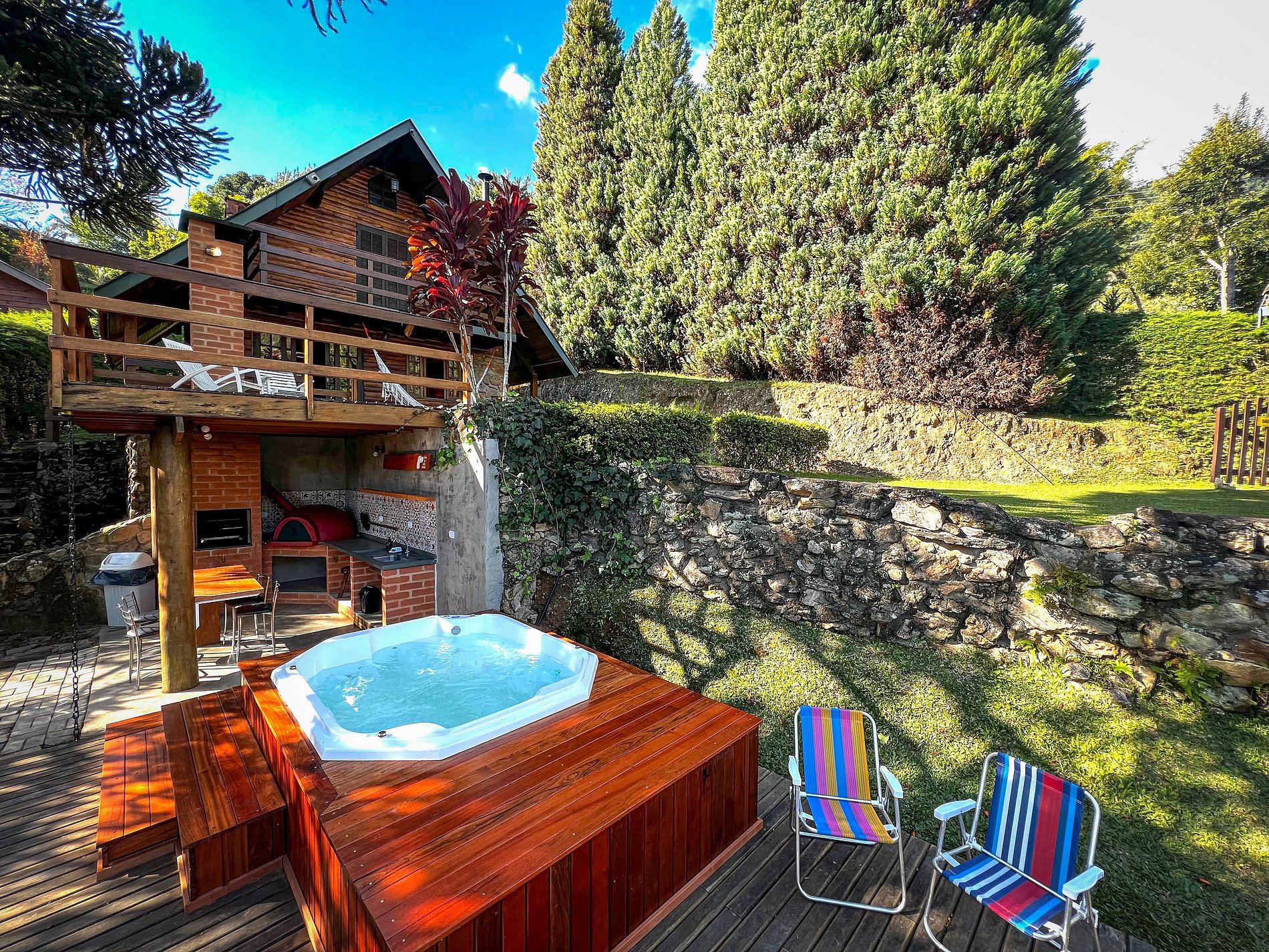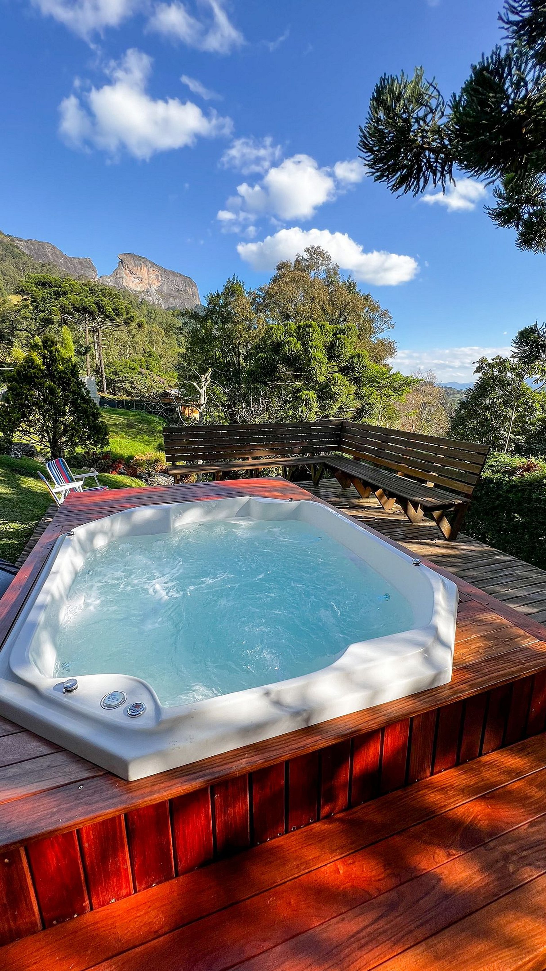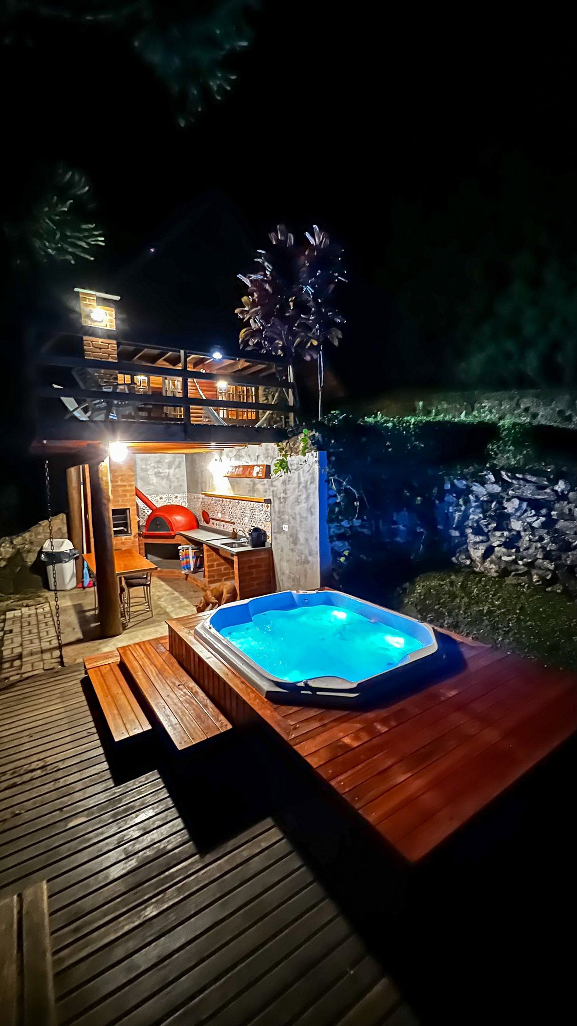 A banheira possui cerca de mil litros de água, por ser bem grande não trocamos a água durante a estadia. Ela funciona como uma piscina, fica com cloro e água tratada (entre as estadias a água é trocada e a banheira totalmente higienizada). Pelo seu tamanho leva cerca de 2/2:30 para aquecer.