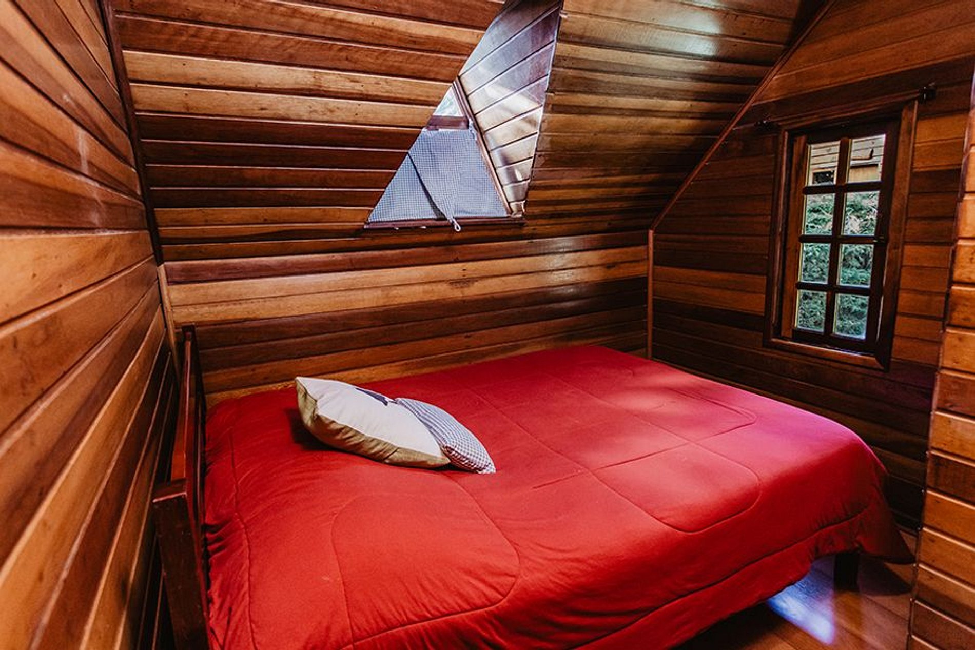 O Chalé São Bernardo possui dois andares, com dois quartos, sendo 1 com uma casal de casal, outro com uma cama de casal e 2 camas de solteiro e uma varanda com vista para a Pedra do Baú.