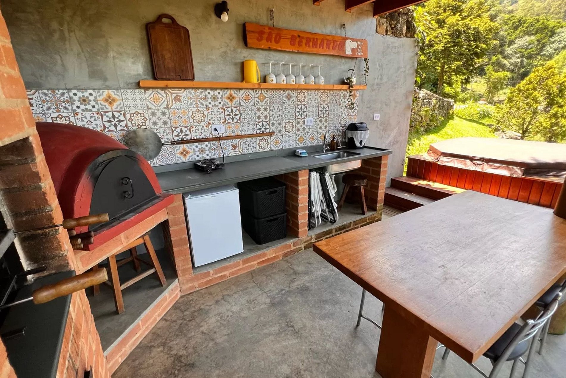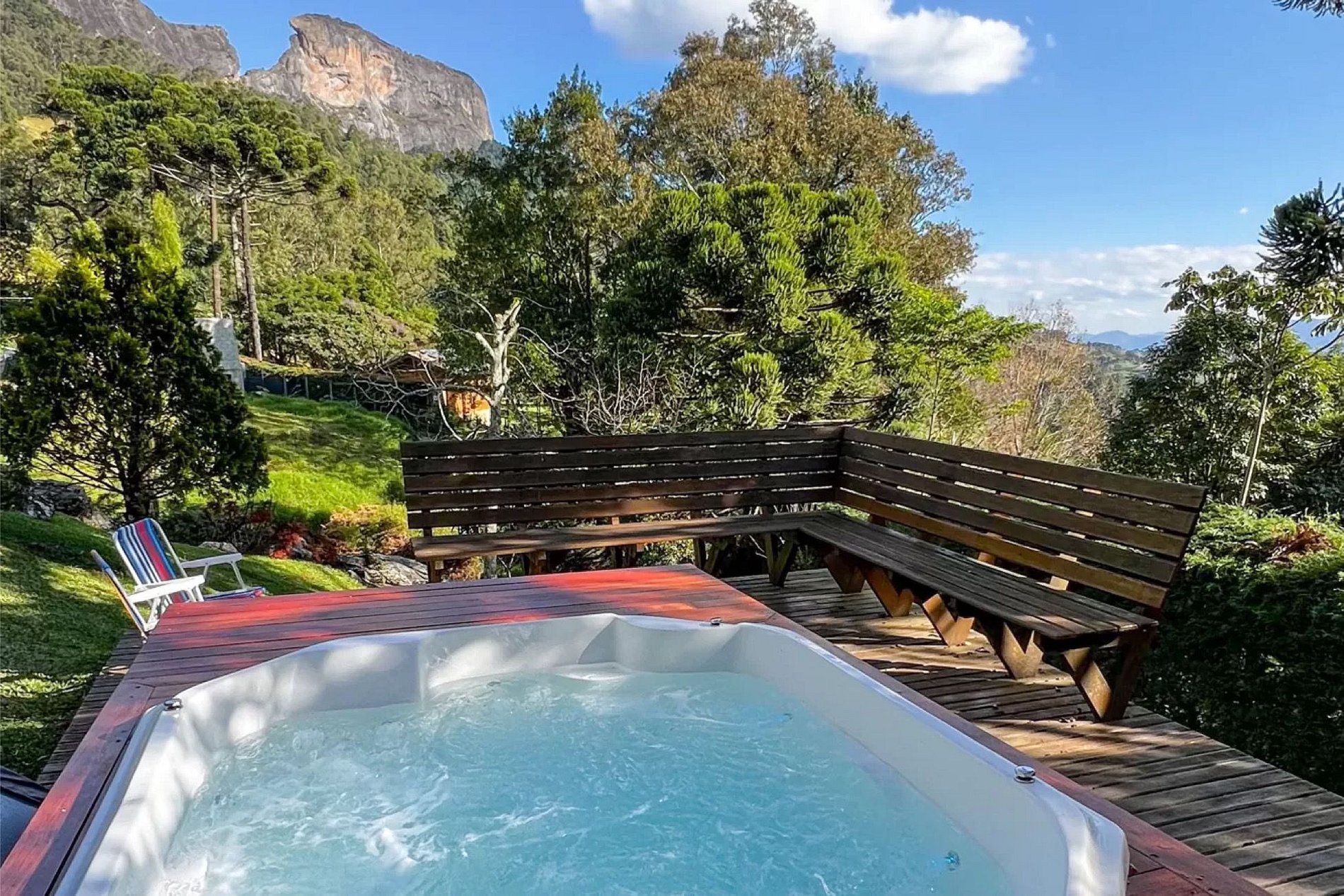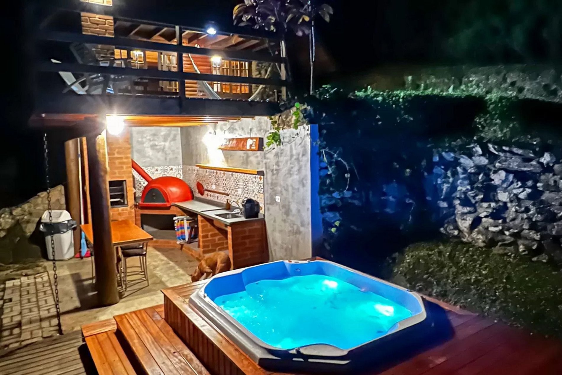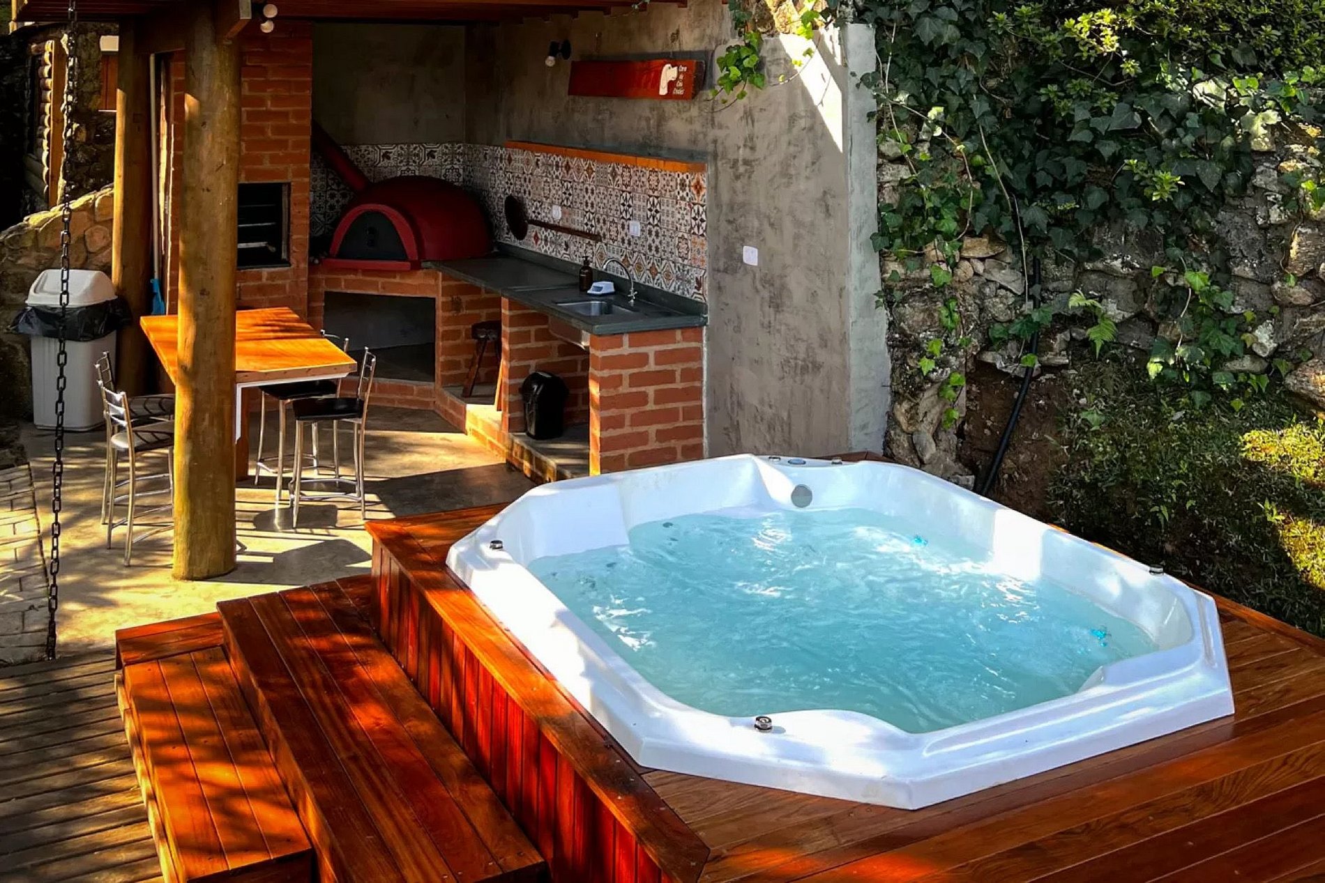 A banheira possui cerca de mil litros de água, por ser bem grande não trocamos a água durante a estadia. Ela funciona como uma piscina, fica com cloro e água tratada (entre as estadias a água é trocada e a banheira totalmente higienizada). Pelo seu tamanho leva cerca de 2/2:30 para aquecer.